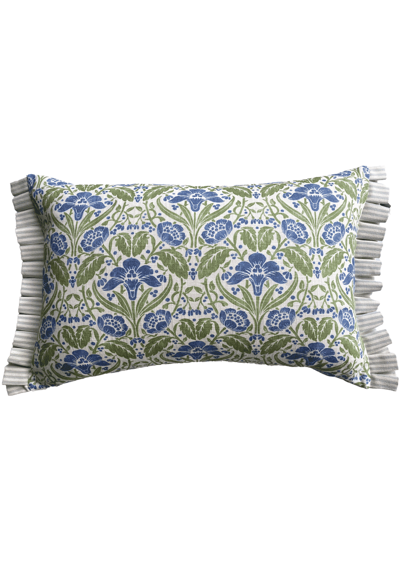 GP&J Baker’s Iris Meadow fabric makes me so happy - this lumbar cushion will look gorgeous on a bed on its own or in front of 2 larger cushions or on a chair (heaven in a garden room). The ruffles down the side add extra length to make a real statement. I hope it makes you as happy as it makes me.